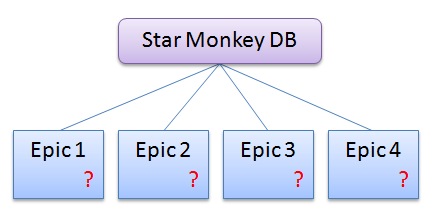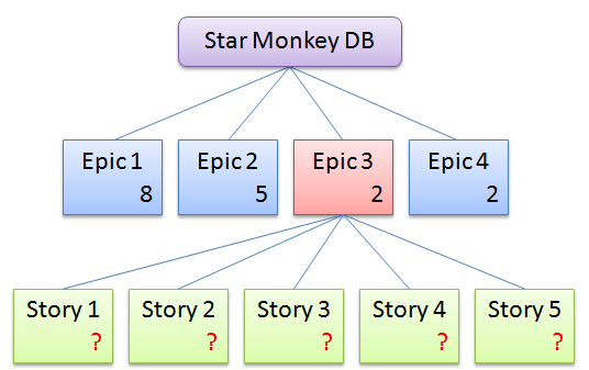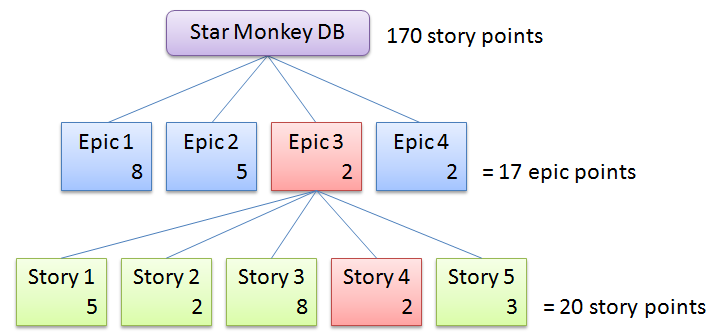 Now we know that 2 epic points are 20 story points; this means that the Star Monkey DB would take, roughly, 170 story points to build. If your team has a established velocity your done. If not you'll have to do a estimated velocity to find out how many iterations you think you need.